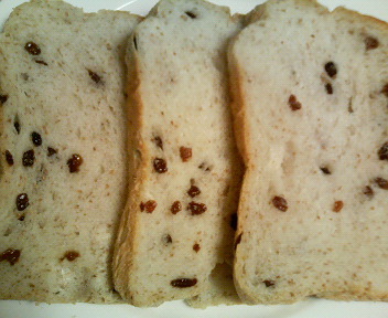 なかなか美味しそうに焼けました。ただ膨らみはグラハム粉が入ったせいか第1弾よりやや小さめでした。グラハム粉が入るとますます噛むと味のあるパンになったようです。ぶどうの甘みも引き立つ感じでどちらかというと焼いて食べたほうが美味しいようです。