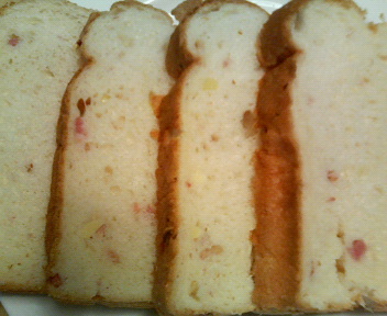 チーズは5ミリ角くらいにしてはじめから材料とともに入れ、ベーコンは厚さ2,3mmの2cm×7mm角くらいのものをレーズン・ナッツ投入で自動投入にしました。